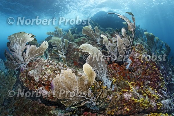 Korallenriff in starken Wellen und Strömung, Venus Seefächer, (Gorgonia flabellum), Little Tobago, Speyside, Trinidad | Coral reef, heavy waves, current, Venus Sea Fan, (Gorgonia flabellum), Little Tobago, Trinidad