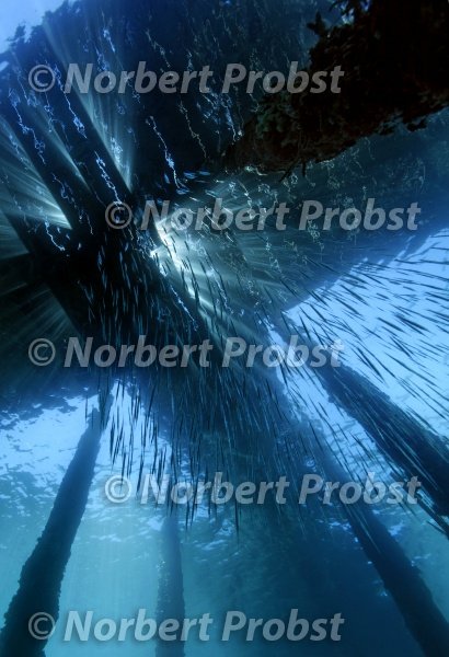 Sonne scheint durch Bootssteg, Fischschwarm mit Gestreiften Schnepfenmesserfischen (Aeoliscus strigatus) Gangga Insel, Bangka Inseln, Nord Sulawesi, Indonesien, Molukkensee, Pazifischer Ozean, Asien | Sunbeams going through jetty, shoal of Banded Shrimpfishes (Aeoliscus strigatus) Gangga Island, Bangka Islands, North Sulawesi, Indonesia, Molukka Sea, Pacific Ocean, Asia