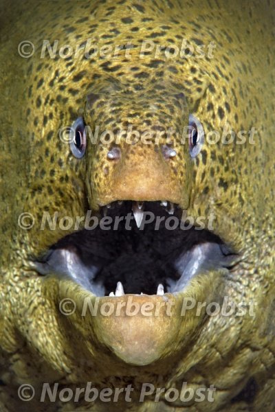 Riesenmuräne, (Gymnothorax javanicus), Portrait, frontal, symmetrisch, Makadi Bay, Hurghada, Ägypten, Rotes Meer, Afrika | Giant Moray, (Gymnothorax javanicus), portrait, head-on, symmetric, Makadi Bay, Hurghada, Egypt, Red Sea, Africa