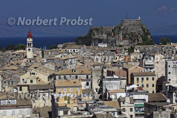 Häusermeer mit alter Festung und St. Spiridon Kirche, Altstadt, Korfu Stadt, Kerkyra, Unesco Weltkulturerbe, Insel Korfu, Ionische Inseln, Griechenland | Sea of houses with old castle and St. Spiridon church, historic district, Corfu City, Kerkyra, Unesco World Heritage Site, Corfu island, Ionian Islands, Greece