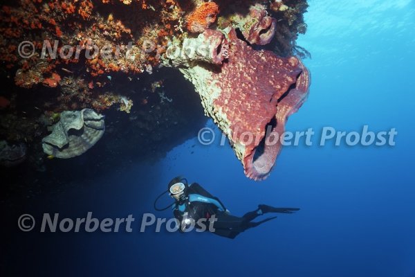 Taucher betrachtet Großer Vasenschwamm (Xestospongia testudinaria) unter Überhang, Wakatobi Island, Tukangbesi Archipel, Wakatobi National Park, UNESCO Weltnaturerbe, Banda See, Südost-Sulawesi, Indonesien | Diver looks at Giant barrelsponge (Xestospongia testudinaria) under overhang, Wakatobi island, Tukangbesi Archipelogo, Wakatobi Marine Park, UNESCO, World Heritage Site, Banda Sea, Southeast-Sulawesi, Indonesia