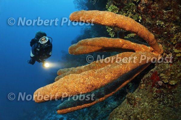Taucherin mit Lampe betrachtet prachtvolles Exemplar Brauner Röhrenschwamm (Agelas conifera) an Steilwand im Korallenriff, Hopkins, Dangria, Belize, Mittelamerika, Zentralamerika, Karibik